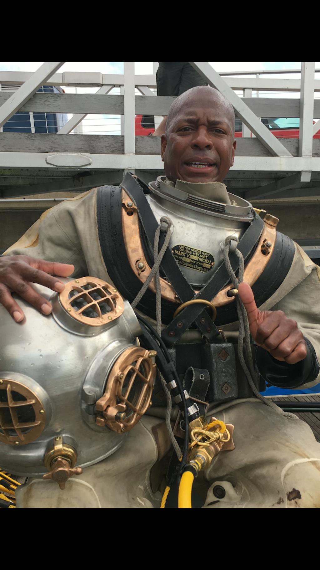 Project Aware Iconic - blue t-shirt with gold diver helmet logo on front on wooden background
